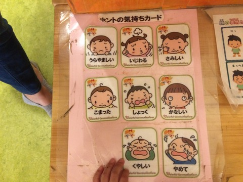 日中は、このカードをみながら、けんかをしてしまった幼児が椅子に座って、順番に。もめごととなる態度をとるに至った感情を伝え合っているのだろうな、と想像しました。